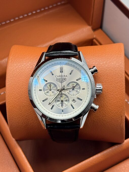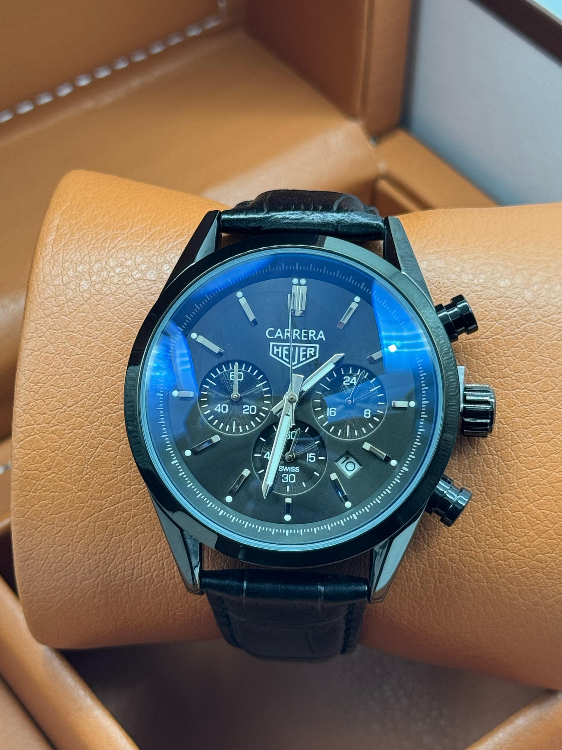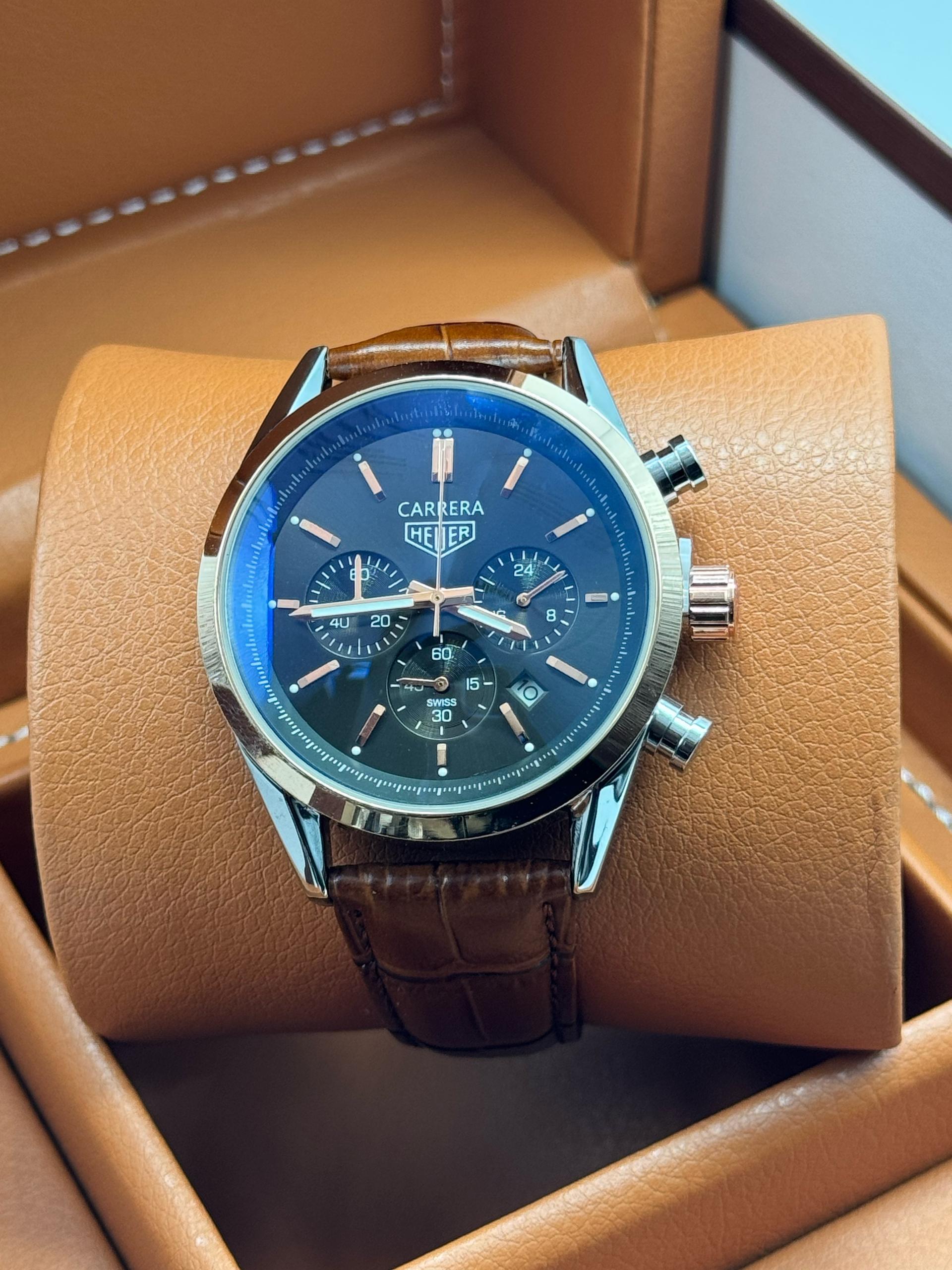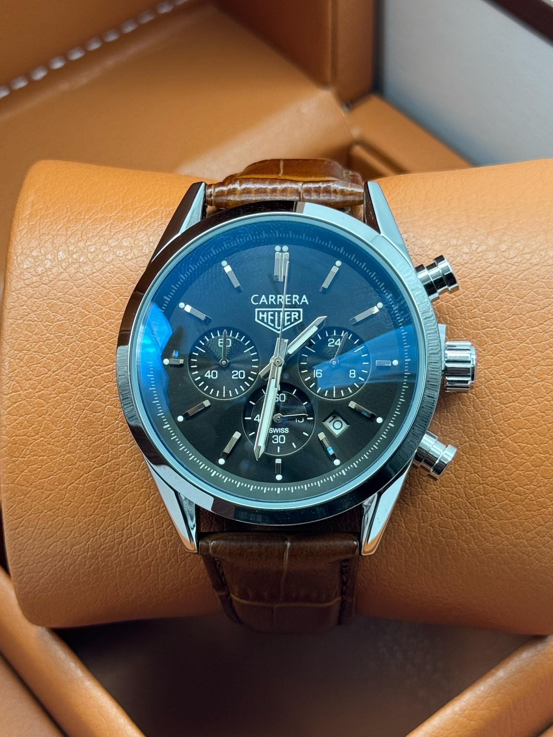 Featuring a sleek stainless steel case, clean dial aesthetics, and paired with a premium leather strap, the Carrera Heuer blends timeless design with contemporary appeal. The rich texture of the leather adds a luxurious feel, making it equally perfect for business meetings or weekend getaways.