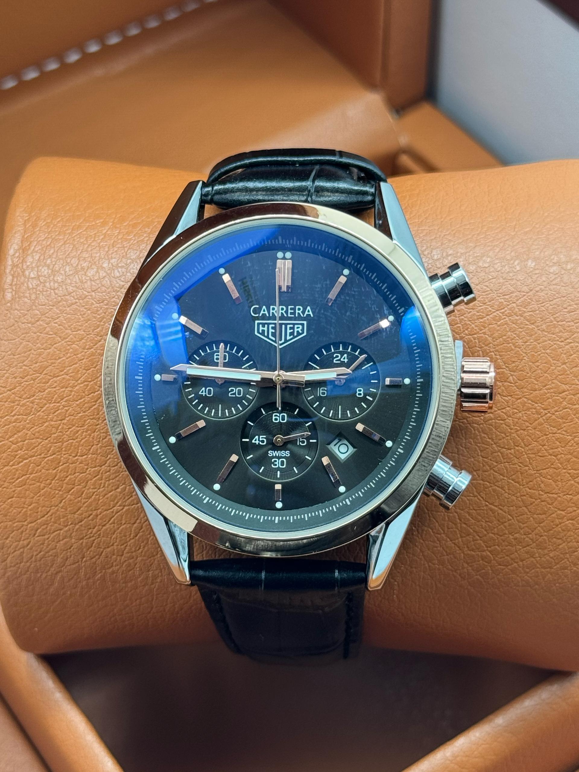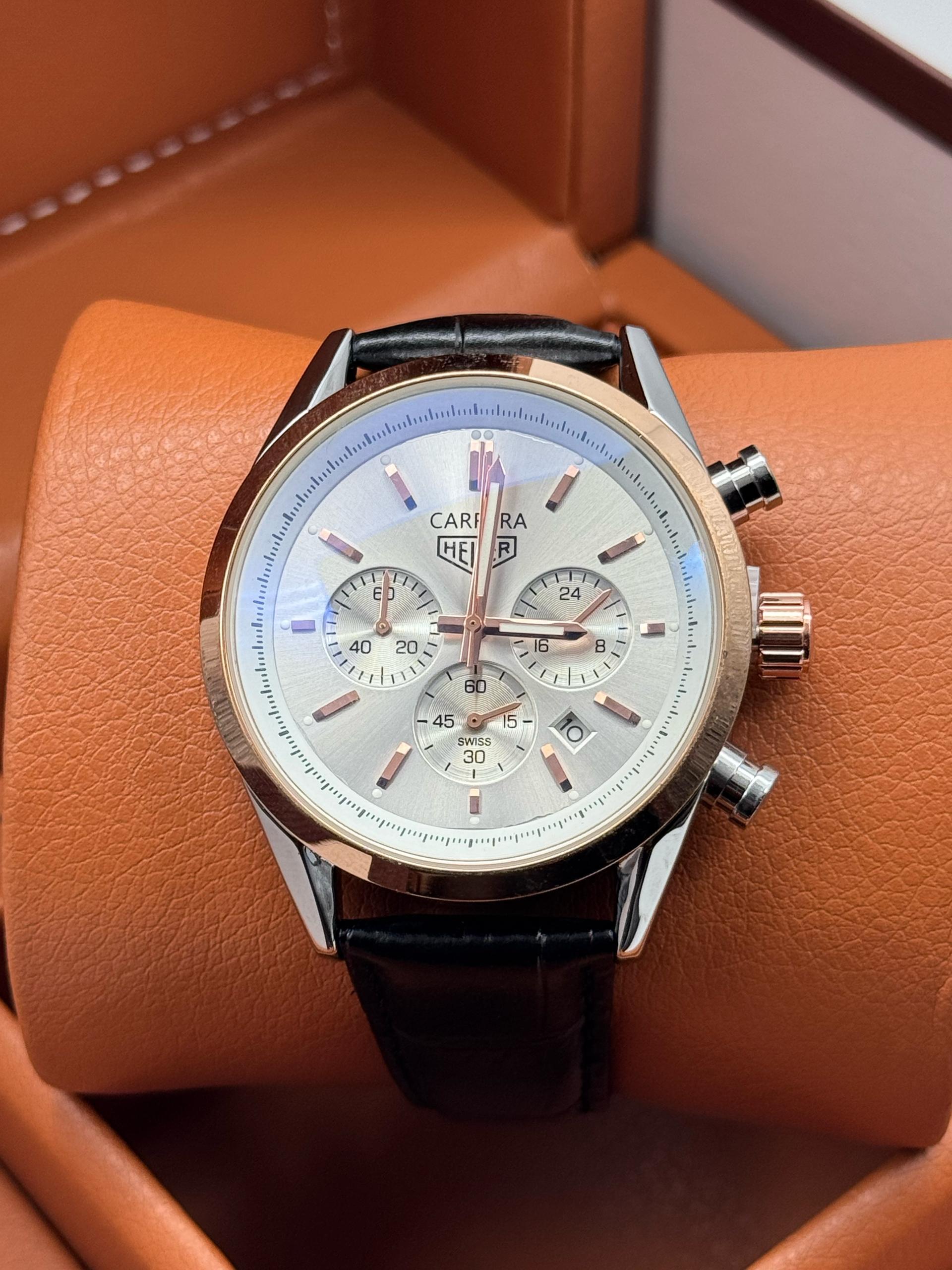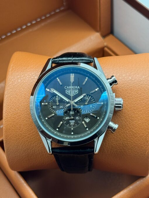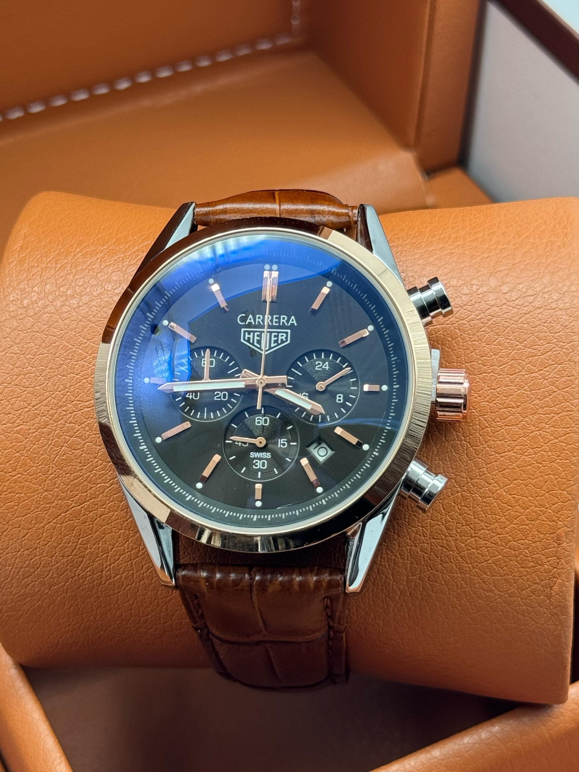 Featuring a sleek stainless steel case, clean dial aesthetics, and paired with a premium leather strap, the Carrera Heuer blends timeless design with contemporary appeal. The rich texture of the leather adds a luxurious feel, making it equally perfect for business meetings or weekend getaways.