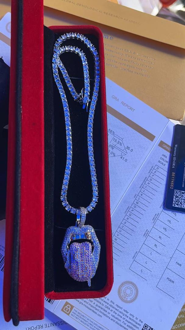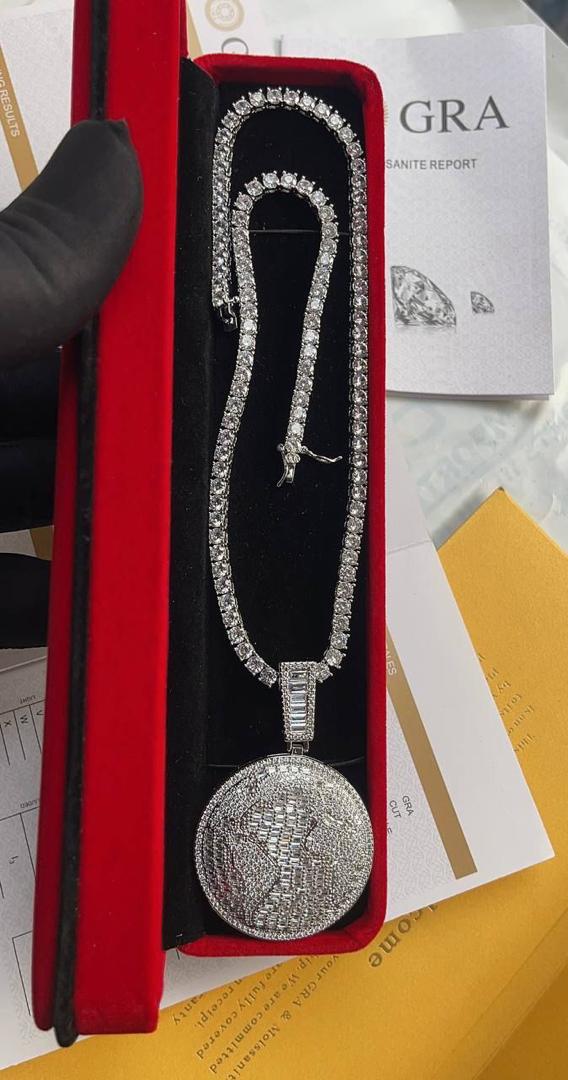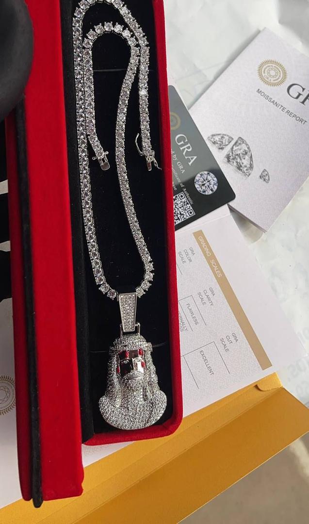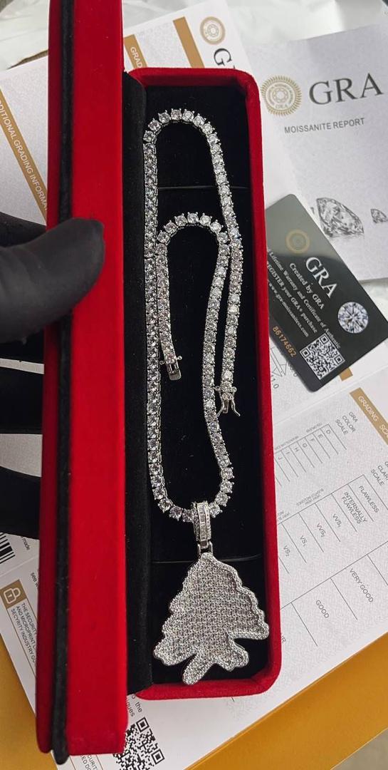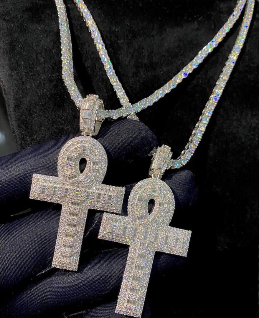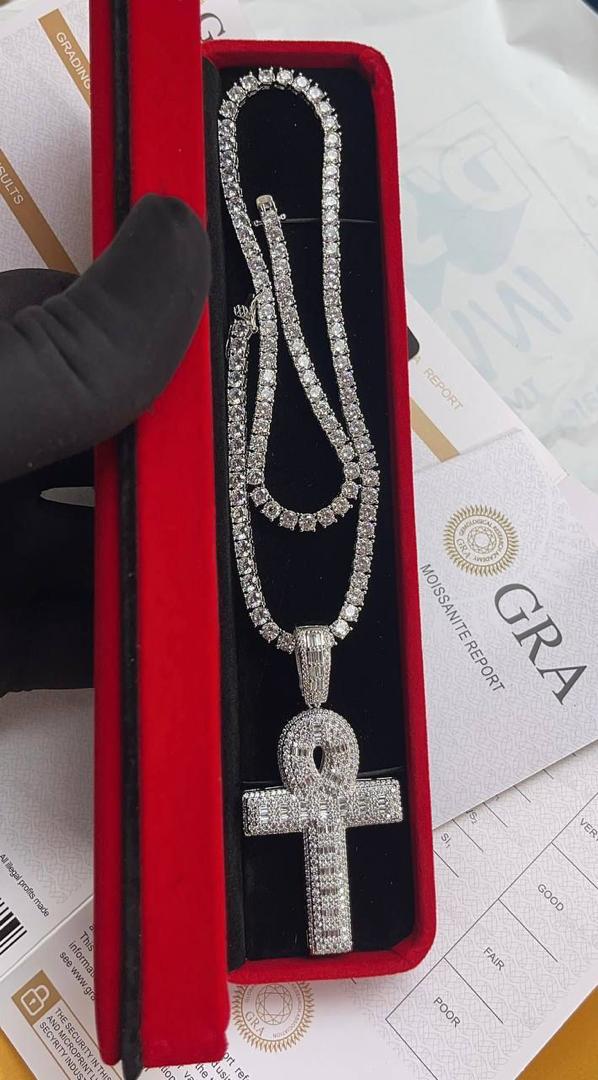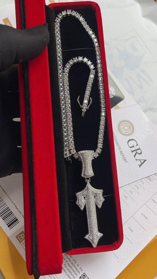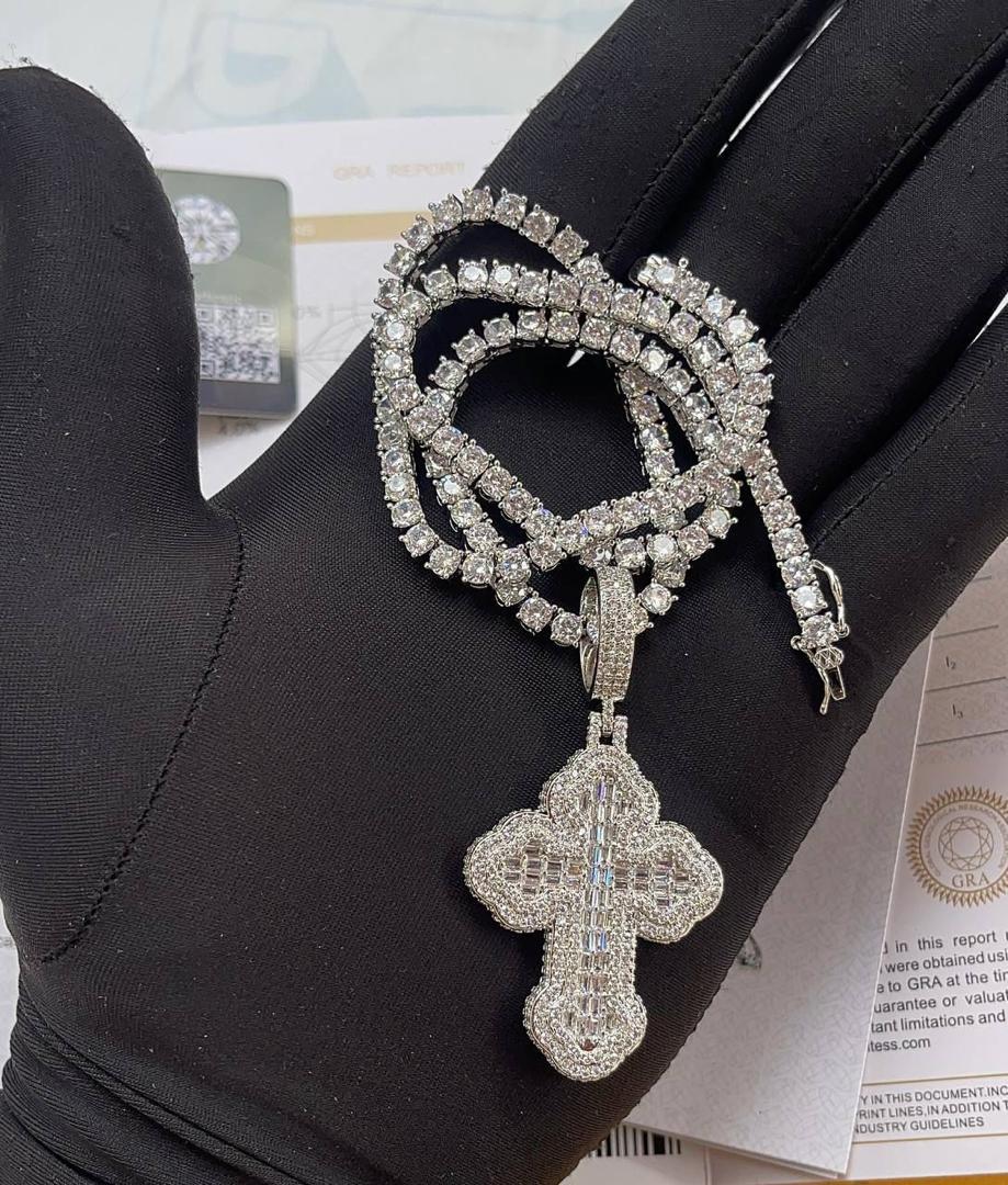 Crafted with VVS clarity moissanite stones, this chain and pendant set delivers an icy shine that never fades. The tennis chain drips with elegance, while the cross pendant adds a personal touch of style and symbolism. Together, they strike the perfect balance between streetwear edge and luxury finesse.